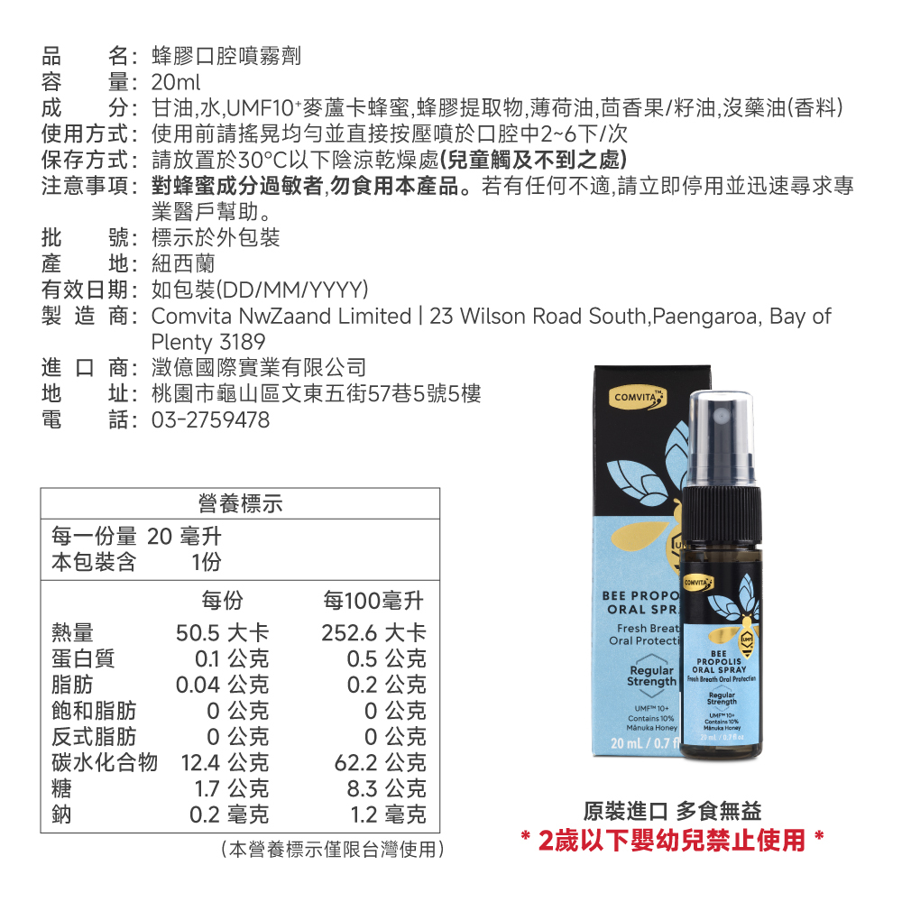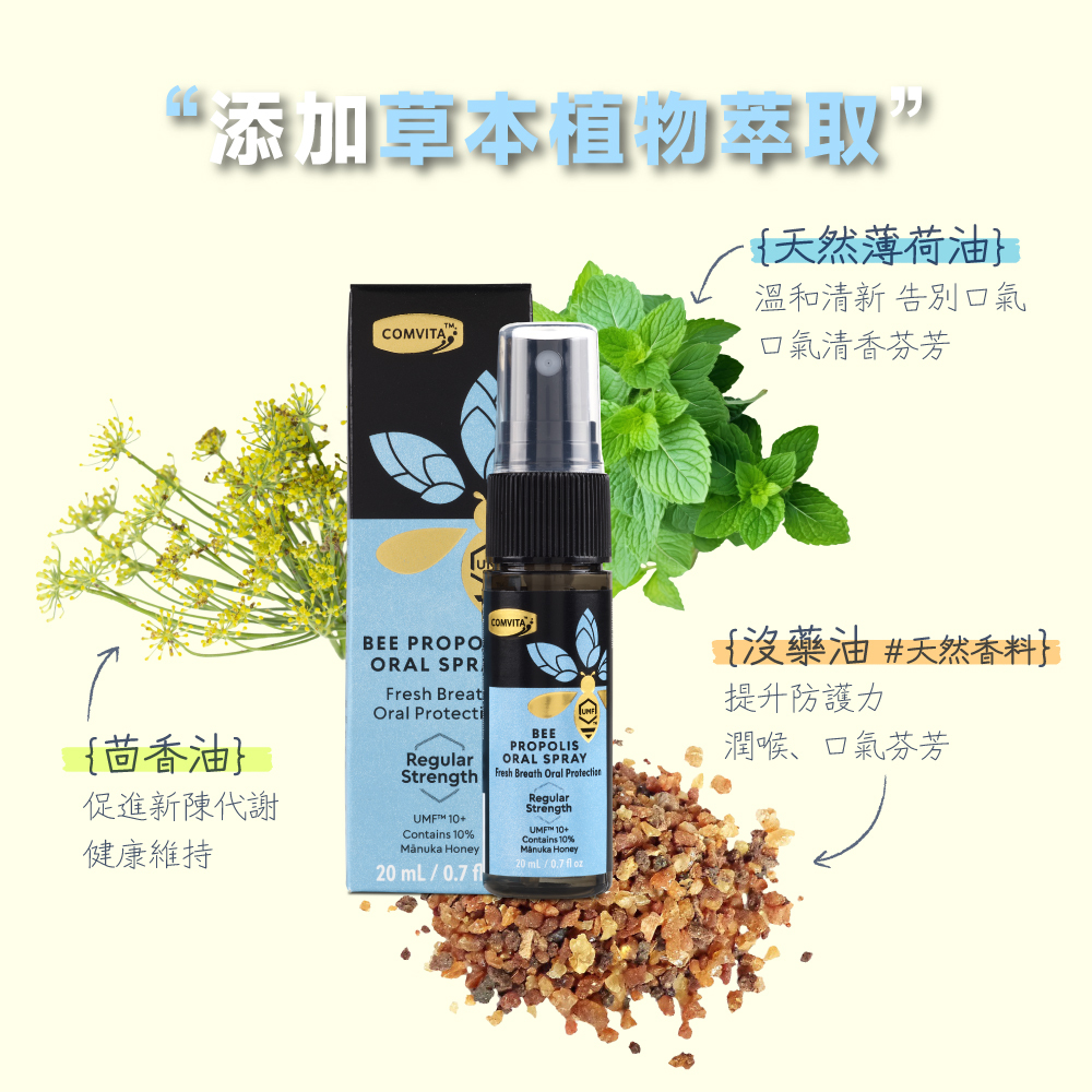 成分:植物甘油、純水、UMF10+麥蘆卡蜂蜜、蜂膠、薄荷油、茴香油、沒藥油(香料)。
