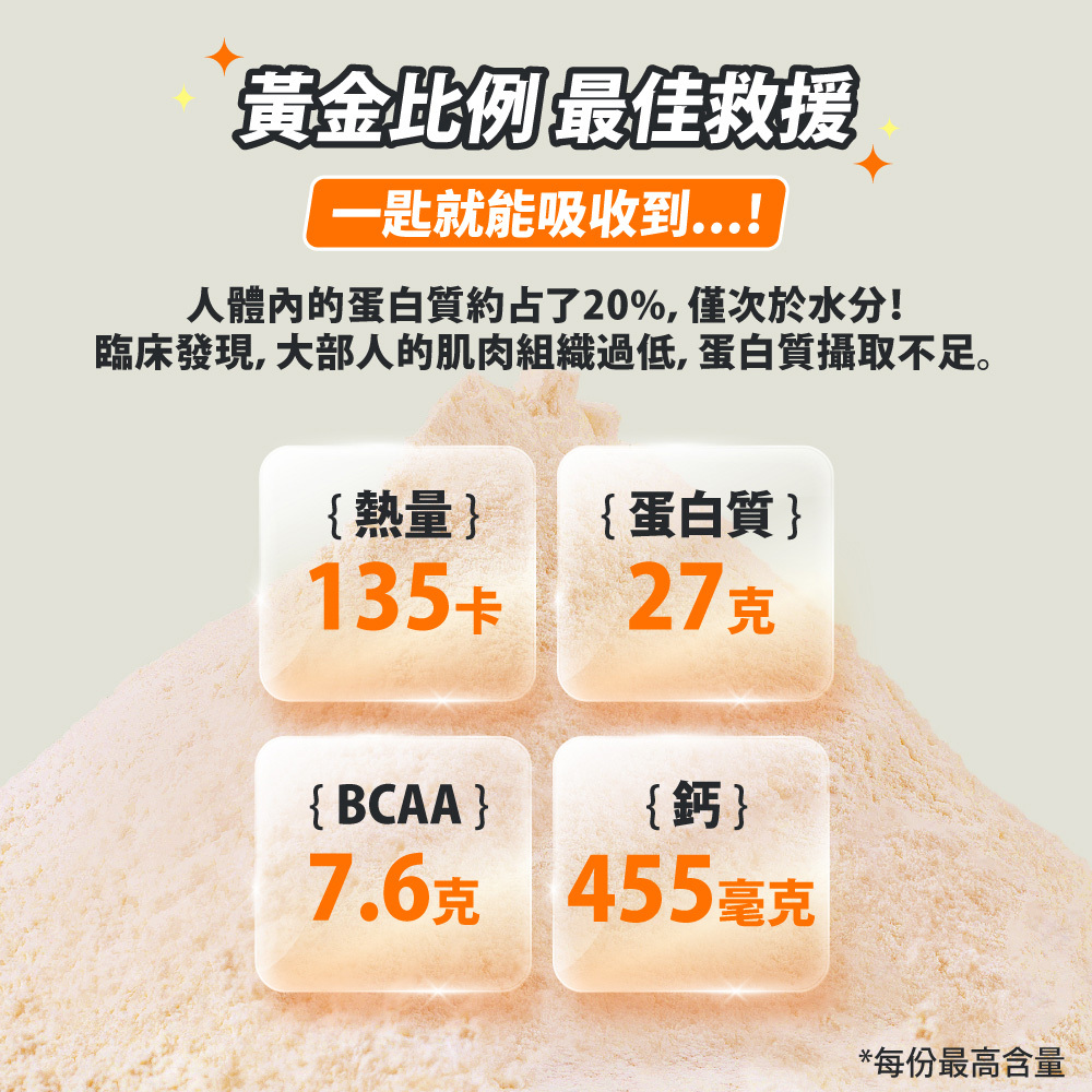 ◆規格:每份26~27g蛋白質 / 7克BCAA / 8種必需胺基酸