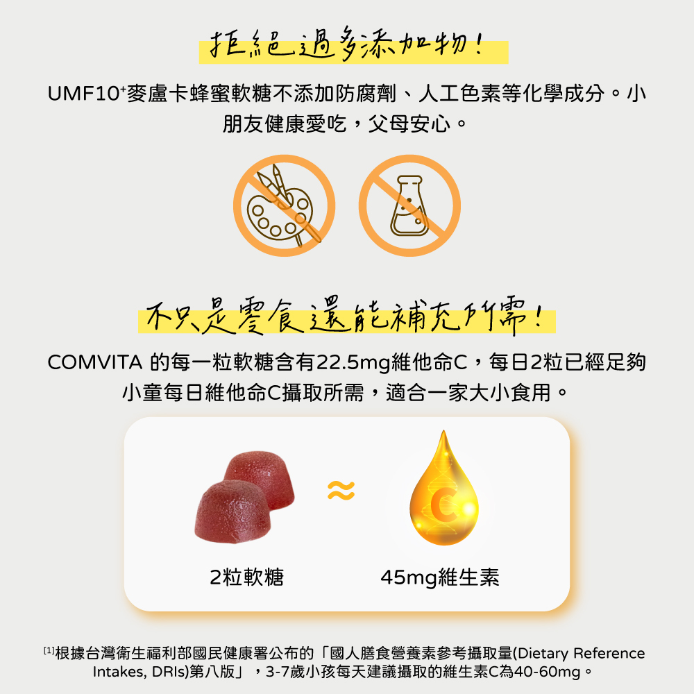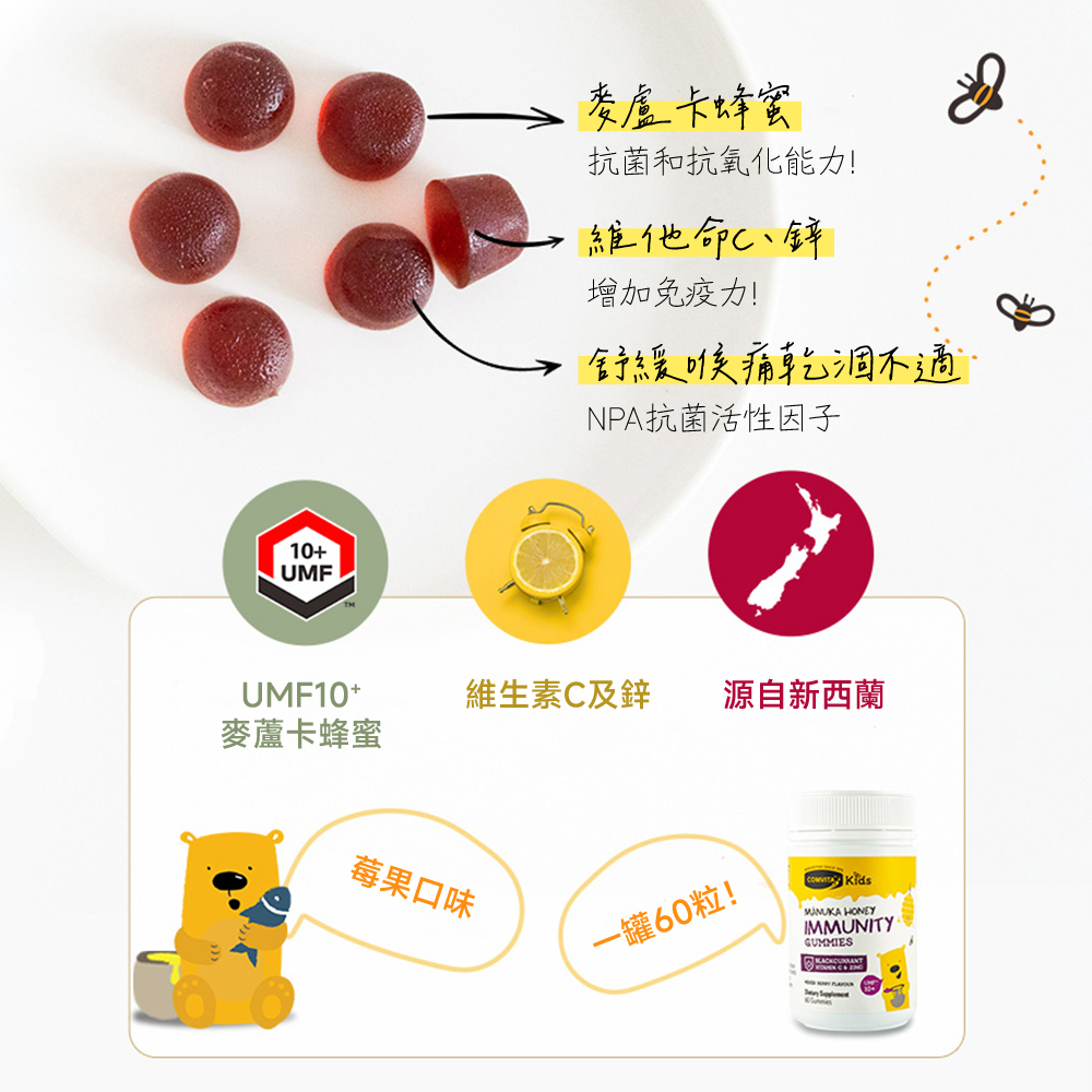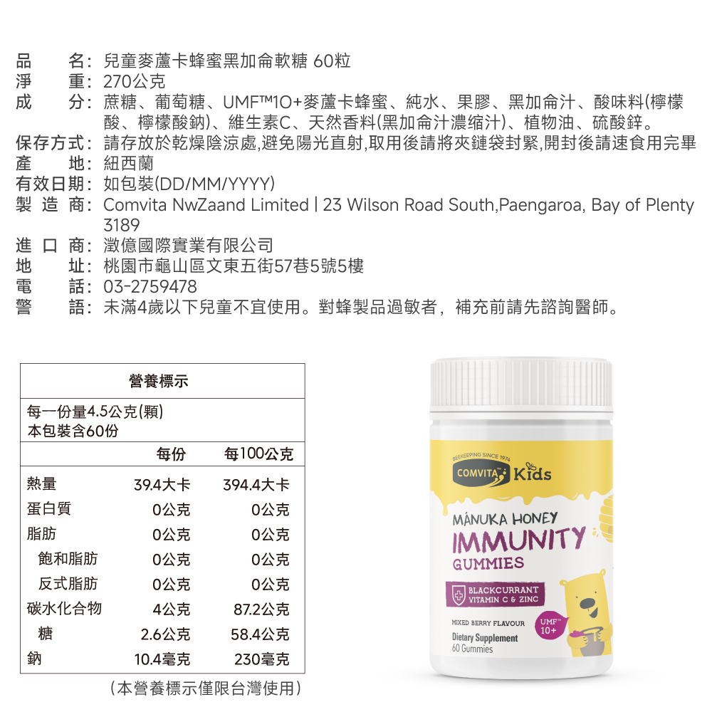 成分:蔗糖、葡萄糖、純水、UMF®10+麥蘆卡蜂蜜、黑膠、黑加侖汁。